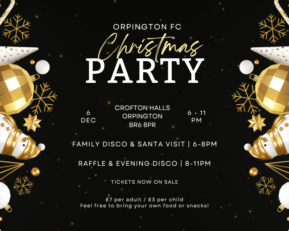 Join us at Orpington FC's Christmas party on 6th December for a festive night filled with dancing, holiday spirit, and a visit from the man himself!